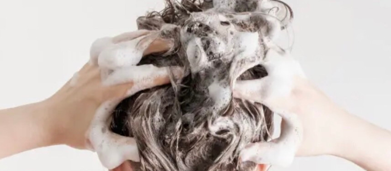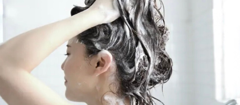 3.用溫熱水沖洗頭皮泡沫帶出的髒污並沖洗頭髮。