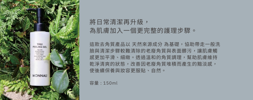 TR50 水素去角質凝露結合 水素概念配方 與多種植萃保養成分,協助去除肌膚表面的老廢角質與多餘髒污,